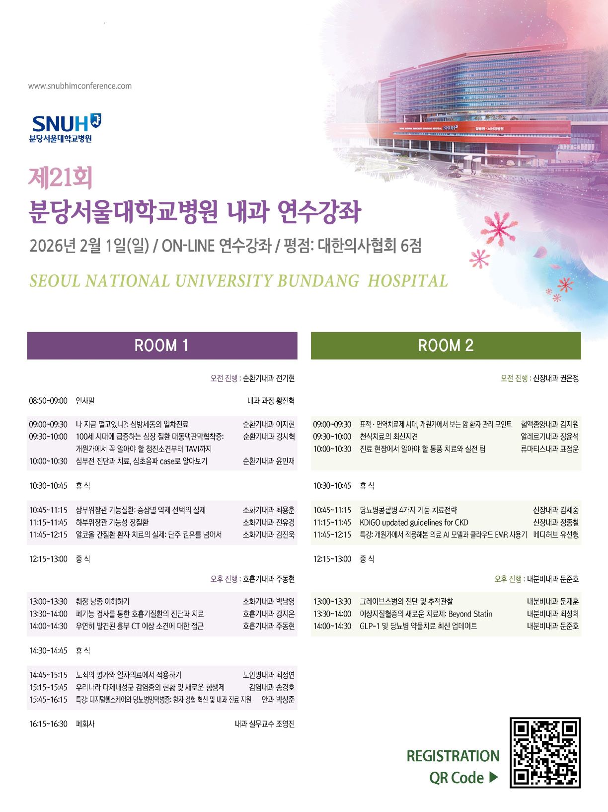 2026년 제21회 분당서울대병원 내과 연수강좌를 개최하오니 많은 관심과 성원을 부탁드립니다.